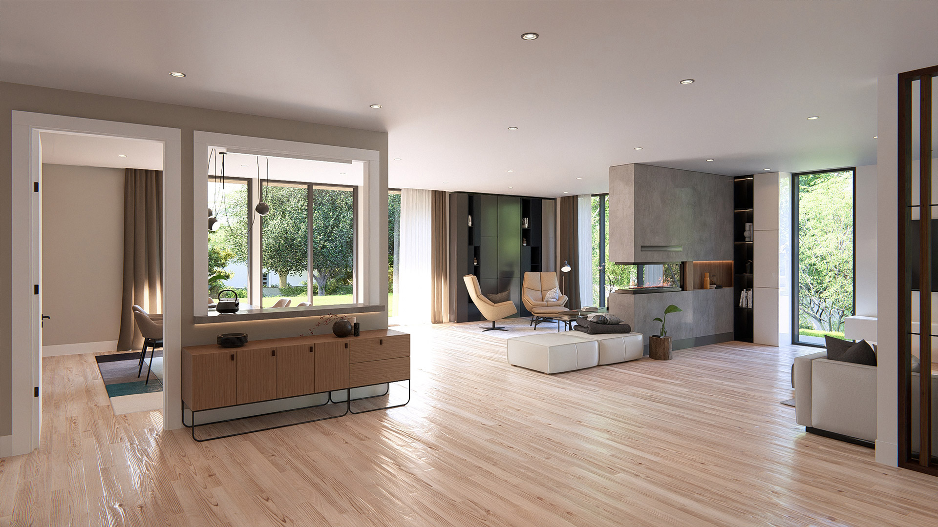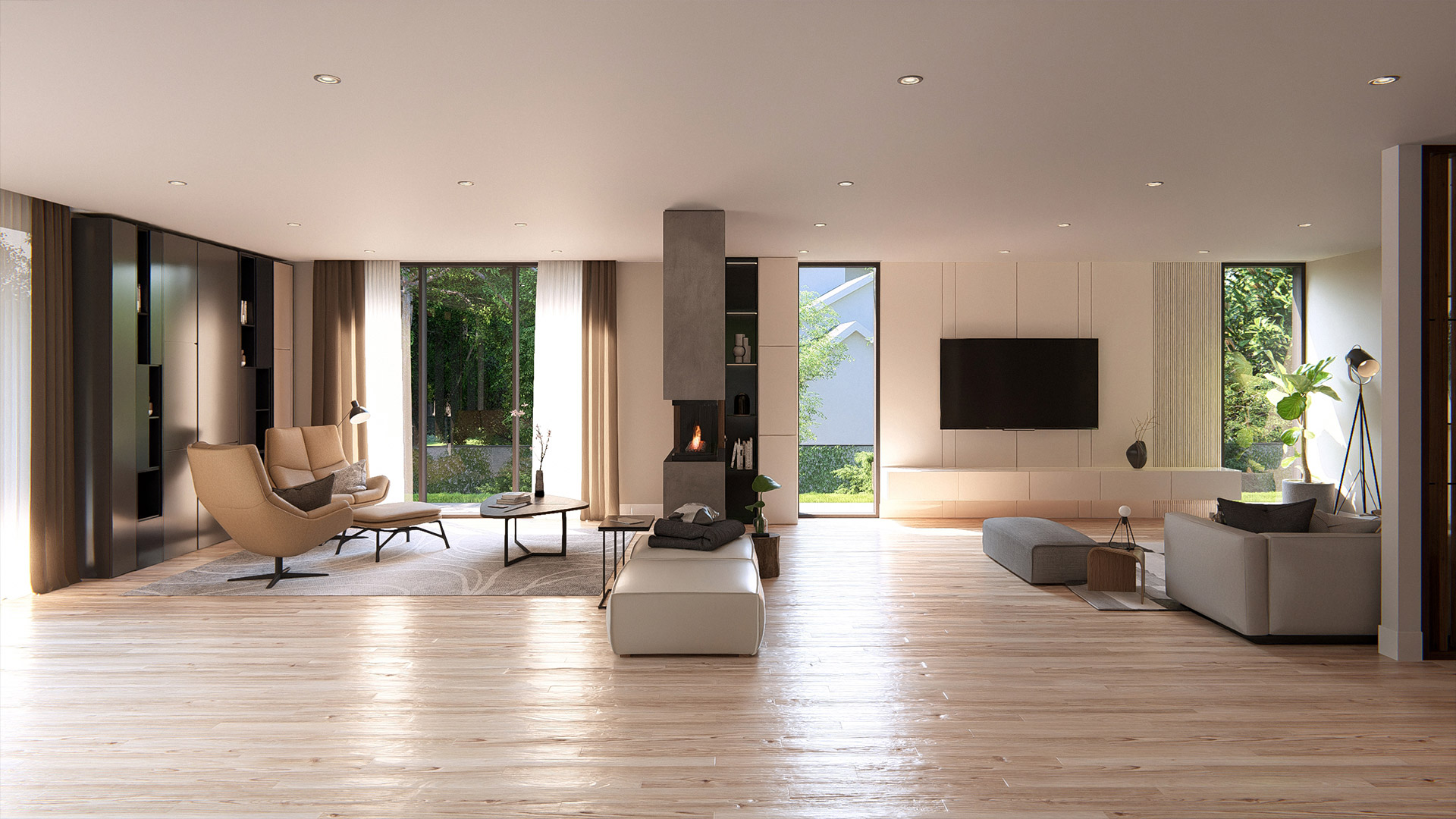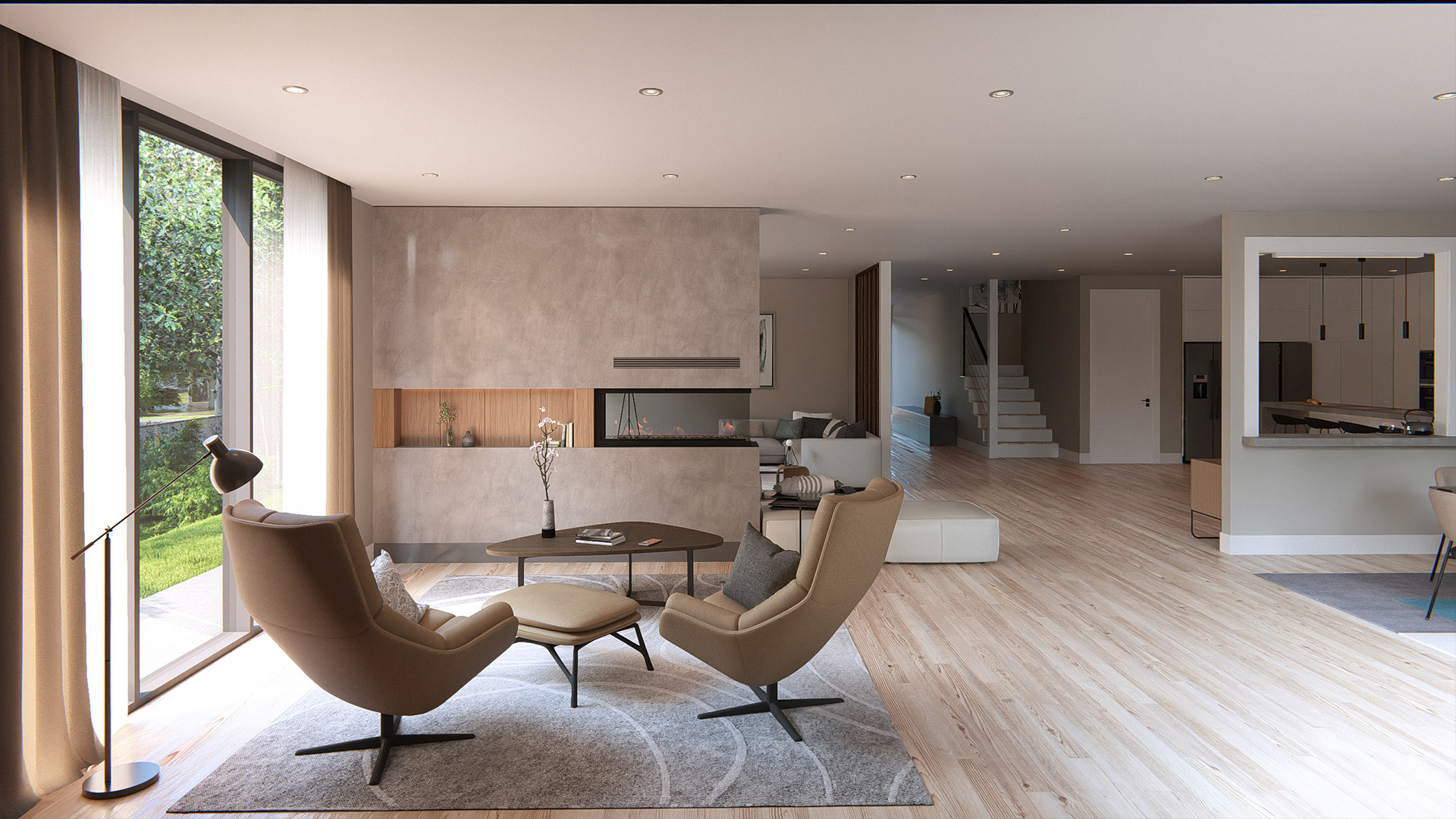 - Architectural volumes that maximize light, height, and spatial fluidity