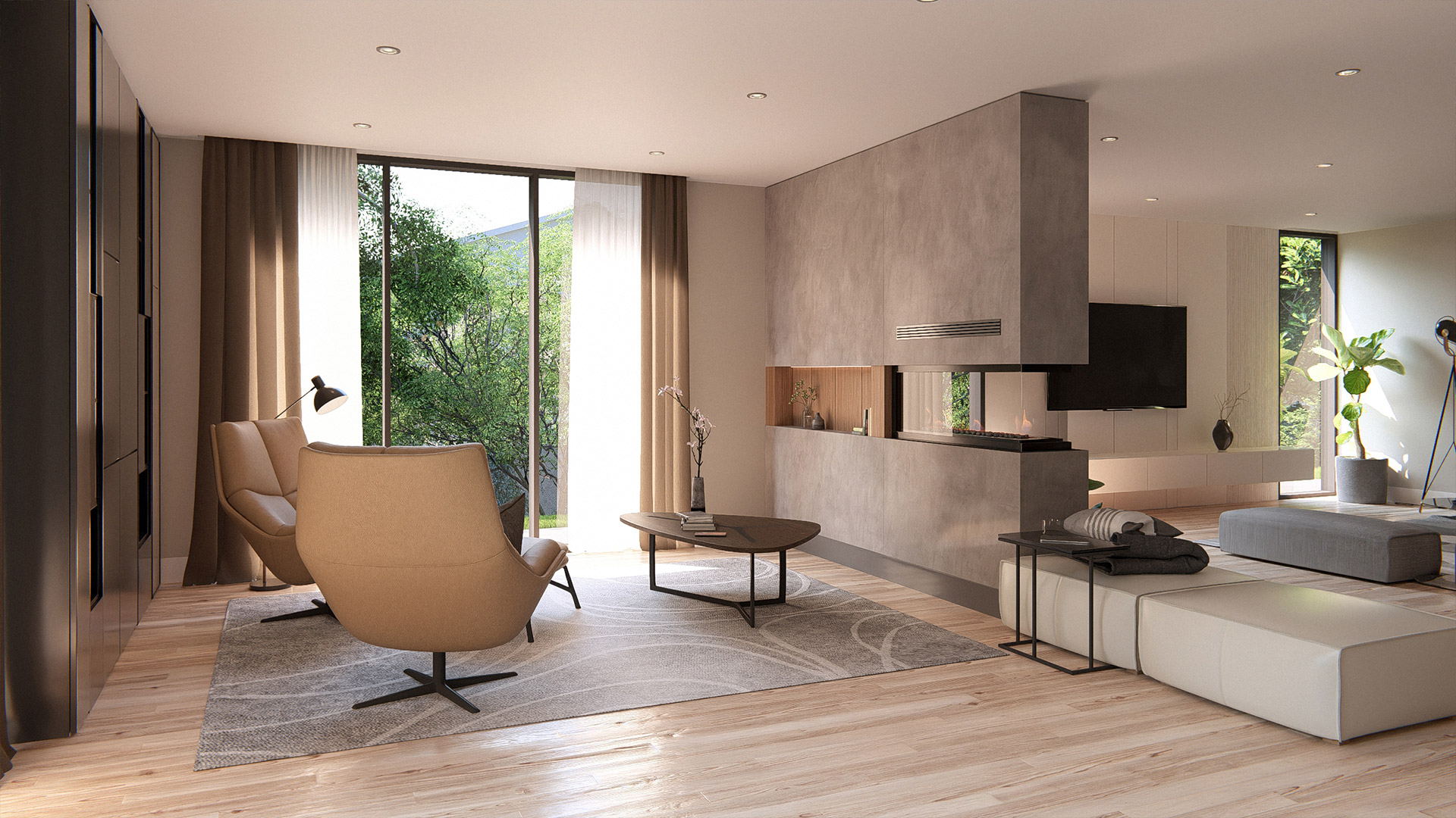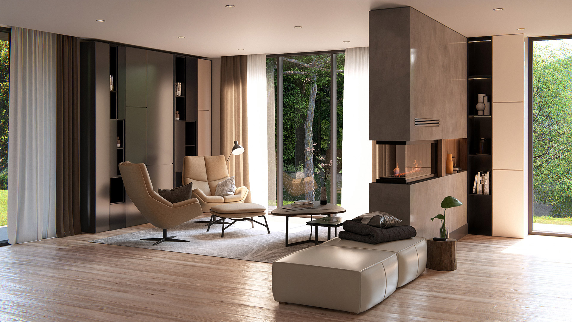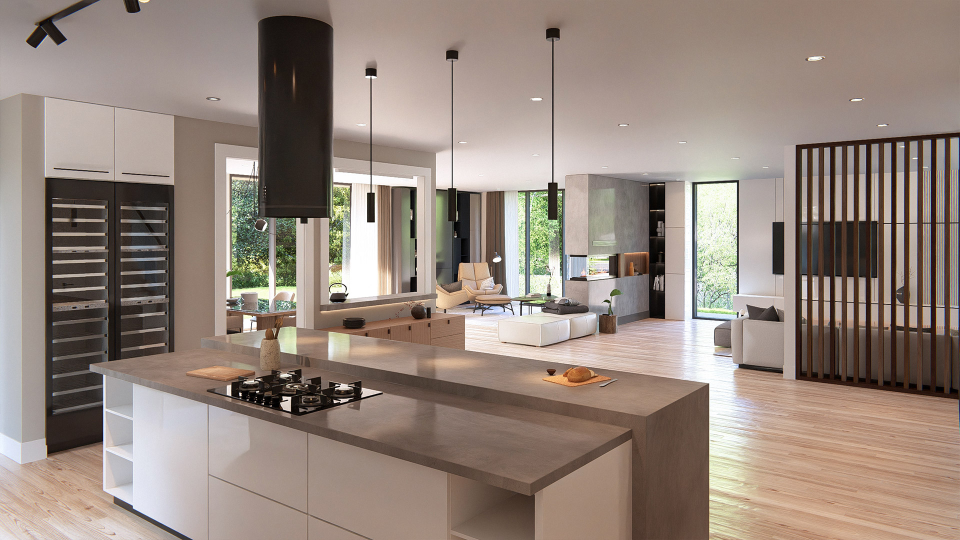 - Architectural volumes that maximize light, height, and spatial fluidity
