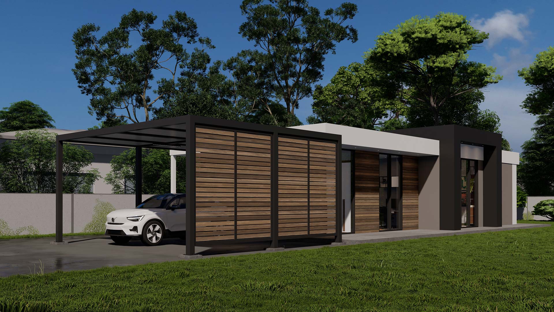 Single-story modern residence with 1,248 sqft of interior living space. Includes 3 bedrooms, featuring a master suite with private bathroom. Offers 2 full indoor bathrooms, an open-concept living room and kitchen, and a two-car covered carport with additional outdoor parking space. Optional garden retreat available, with the possibility of adding a pool or ADU.
